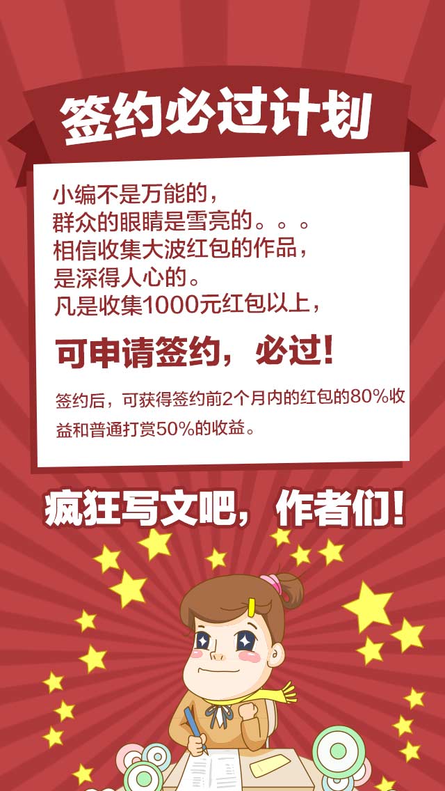 1、内容积极向上,没有不良引导性,不涉黄,不涉政,不涉黑; 2、为作者本人原创作品,没有抄袭,剽窃,过度引用,借鉴等行为; 3、作品达到3万字,且更新稳定; 4、符合条件的作品,请以发邮件至fuli17K@qq.com申请,申请审核时间为3-5个工作日。 邮件标题:书名《XXXX》,申请签约必过计划 邮件正文:书名《XXXX》,字数:XXXXX,链接XXXXXXXXX